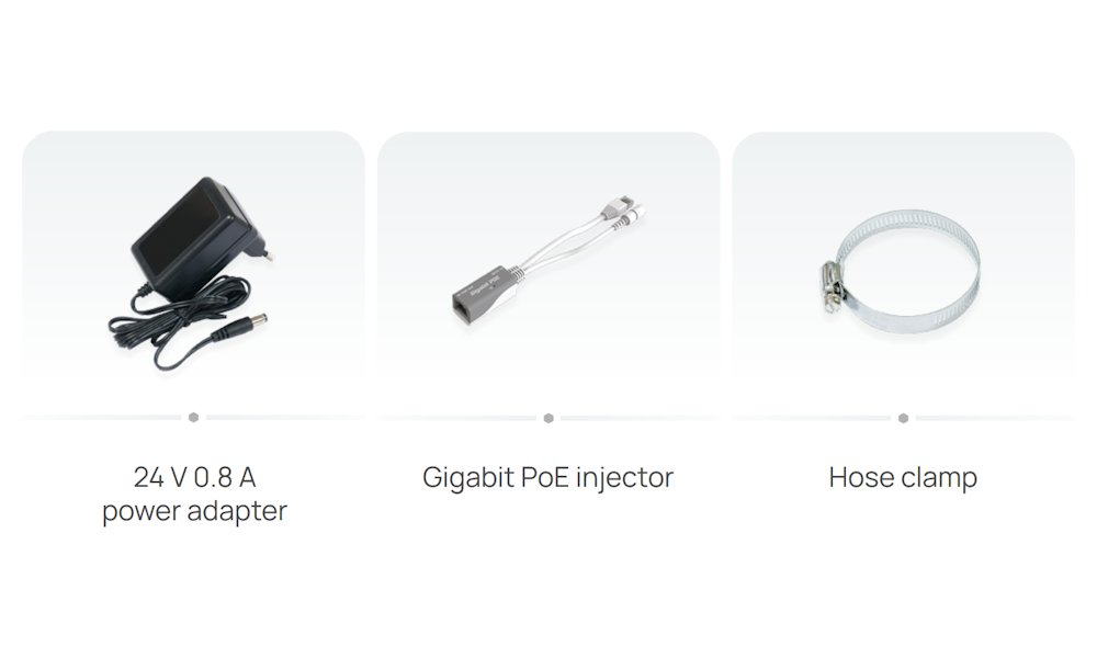 Obsah balení: napájecí adaptér 24 V/ 0,8 A, gigabitový PoE injektor, kovový stahovací pásek