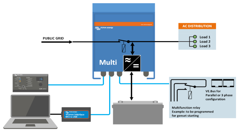 The MultiPlus can be used in off-grid systems as well as grid-connected photovoltaic systems. While the MultiPlus is not equipped with an input for PV panels, it is designed to work with MPPT controllers (for DC-coupled systems) or grid inverters (for AC-coupled systems).