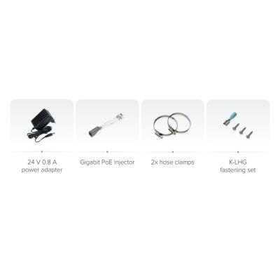 LHGG LTE7 kit, power adapter (24 V), Gigabit PoE injector, 2× cable tie/clamp, K-LHG mounting kit