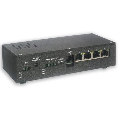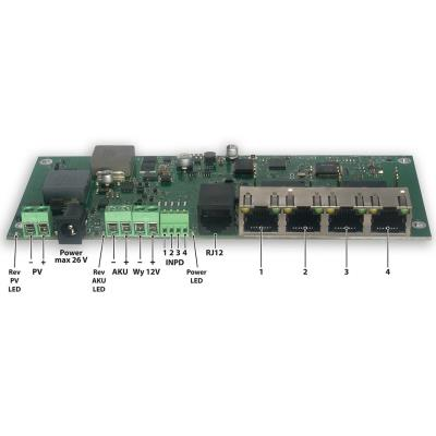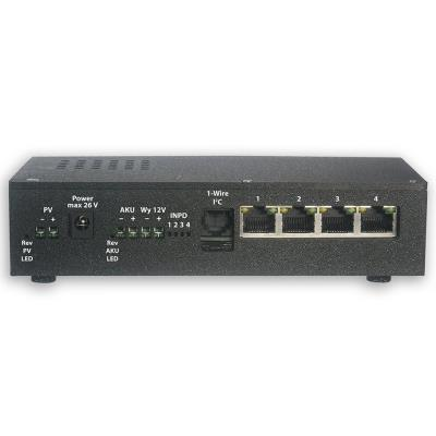 Introducing a compact network switch designed for powering devices in locations without access to the electrical grid. The device features four 10/100 Mb/s ports with active 48V PoE standard 802.3af/at on each port with a total power output of 40 W (20 W per port). The integrated MPPT charger efficiently charges a 12V gel battery with a current of up to 4 A from a solar panel with an operating voltage of 16.5–22.5 V.